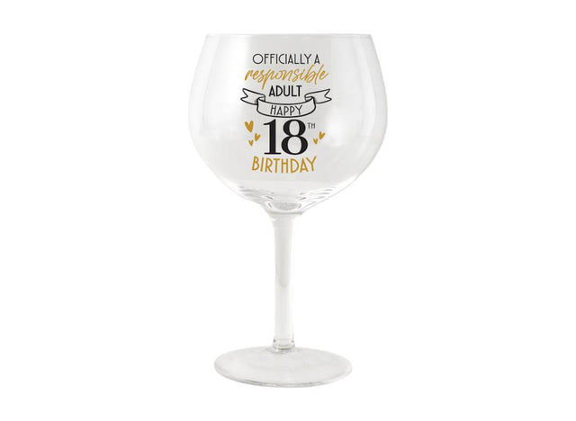 Toast a milestone 18th birthday in style with this large balloon wine glass. The stunning black and gold foil decal reads: "Officially a responsible adult. Happy 18th Birthday".
