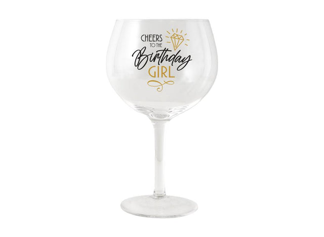 Toast the birthday girl in style with this large balloon wine glass. The stunning black and gold foil decal reads: "Cheers to the birthday girl".