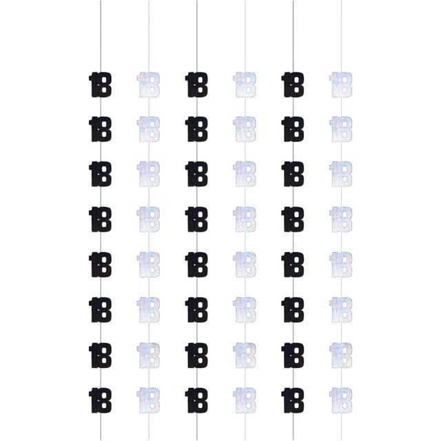 Pack includes 6 strings with cutouts of "18" in prismatic black and silver foil.