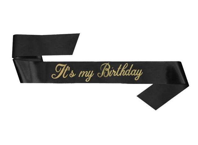 Feel like a birthday King or Queen with this black satin sash featuring "It's my Birthday" screenprinted in gold.