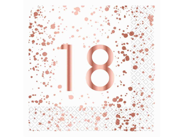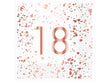 Celebrate a stylish milestone 18th birthday with these white lunch napkins featuring the number 18 and a rose gold confetti design embossed in shiny rose gold.