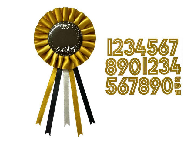 The black badge features a gold satin ribbon rosette, with "Happy Birthday" headline and space to add their age with the included stickers.