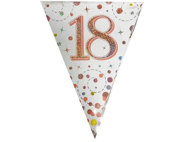 Add a touch of sparkle to your birthday decor! These white bunting flags feature a rose gold, gold and silver confetti design with "18" and sparkling holographic finish.
