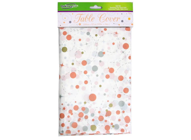 Add some sparkle to your party table with this white tablecover featuring a rose gold, silver and gold confetti and swirls design along the sides. The centre is plain so your tableware will really pop!