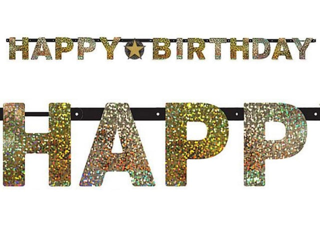 The silver and gold jointed card letters have a sparkly holographic finish. Banner is easy to hang using the strings provided at each end.