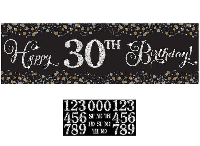 The banner reads "Happy Birthday" in black, gold and silver sparkling design, with space in the centre to add any age using the stickers included.