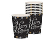 Stylish cups in gold, silver and black with Happy Birthday script.
