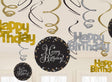These black, gold and silver hanging swirl decorations are a stylish and easy way to decorate your birthday celebration.