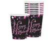 Stylish cups in pink, silver and black with Happy Birthday script.