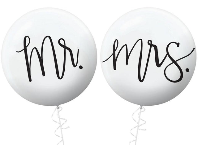 Halfway between a standard balloon and a Jumbo balloon, these 60cm round balloons will create an impact at your Wedding. The white balloons feature "Mr" and "Mrs" in stylish black font.