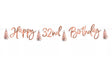 The banner features "Happy Birthday" in metallic rose gold cutout letters, four coordinating foil tassels, plus numbers and symbols to customise with their age.