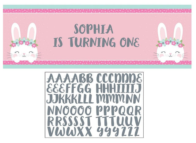 The banner features two cute bunnies and a pink background with mint green border. Use the grey letter stickers to spell out your message.