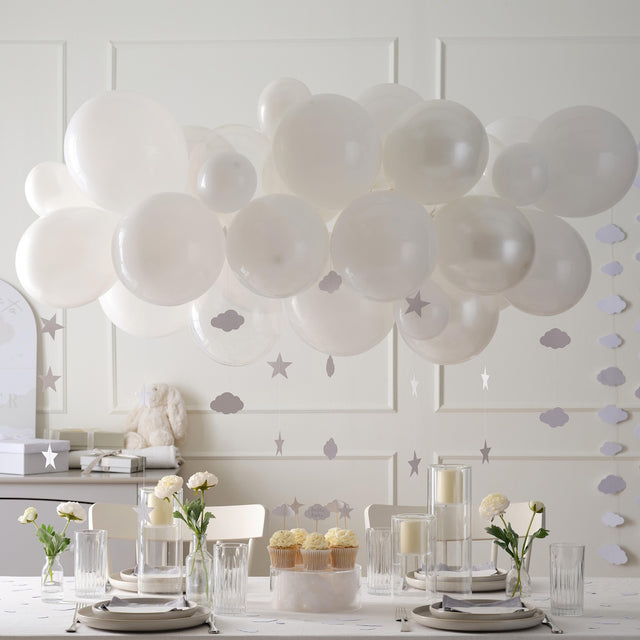 40 x white, clear and pearlised balloonsin assorted sizes with 7 x cloud and star balloon tails to hang.