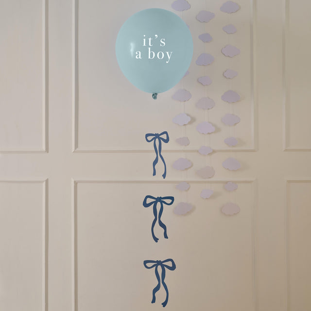 Pack Contains 1 x 45cm blue 'it's a boy!' latex balloon, with nylon string featuring 3 x attached blue cardboard cutout bows.