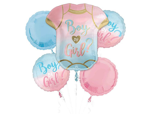 Decorate your gender reveal celebration with this gorgeous cluster of 5 foil balloons.