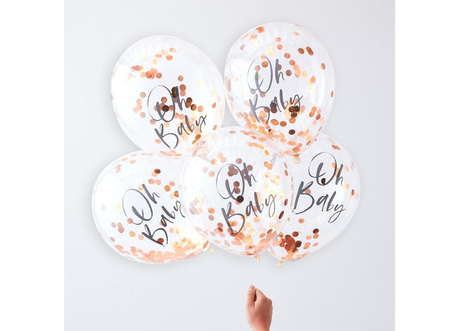 Pack includes 5 x clear 30cm latex balloons, filled with rose gold foil confetti.