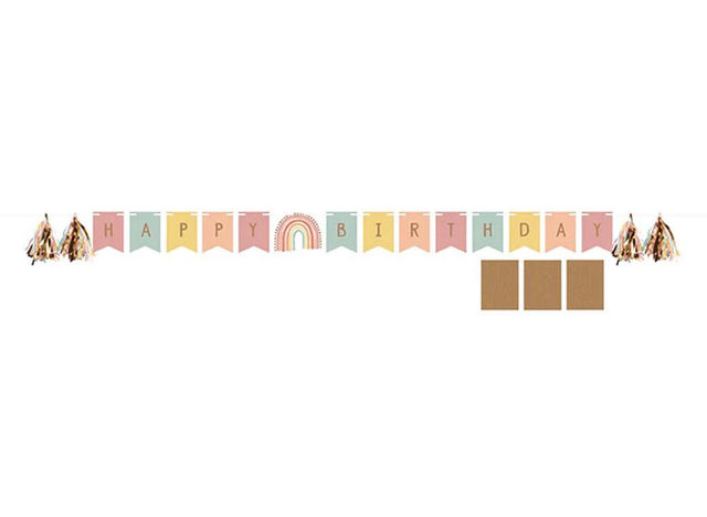 The banner features 13 pennant flags, and comes with a sweet rainbow cutout, tassels, ribbon and copper stickers. Apply your choice of stickers to create a "Happy Birthday" or "Welcome Baby" message. Pennants can be left blank if desired.