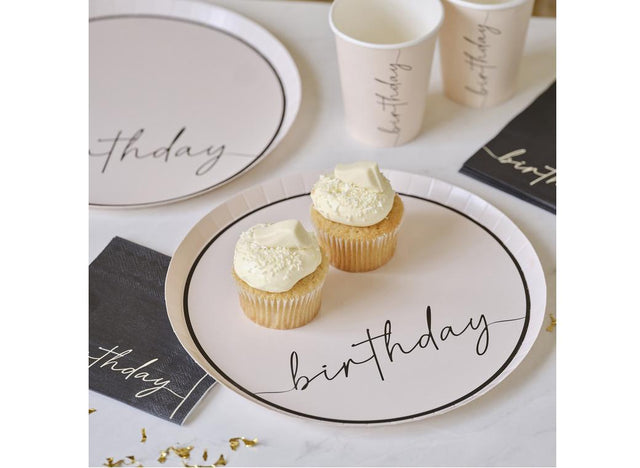 Featuring a stylish "birthday" script in black, this gorgeous design will look incredible at your birthday party.