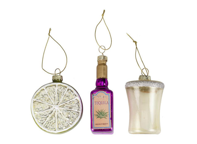 Celebrate the good times with this tequila bottle, lime and shot glass tree decoration set. Perfect for your party loving pal, or to add a touch of fun to your Christmas tree.