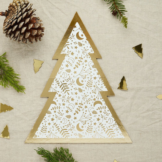 The tree-shaped board features moon, star and botanical motifs in shiny gold foil.