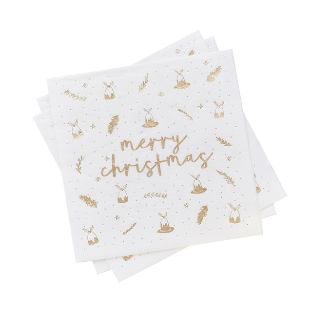 Add a festive touch to your table with these elegant Merry Christmas Napkins. Each white napkin is beautifully embossed with shiny gold foil lettering and delicate holiday illustrations, bringing sparkle and charm to your Christmas celebration.