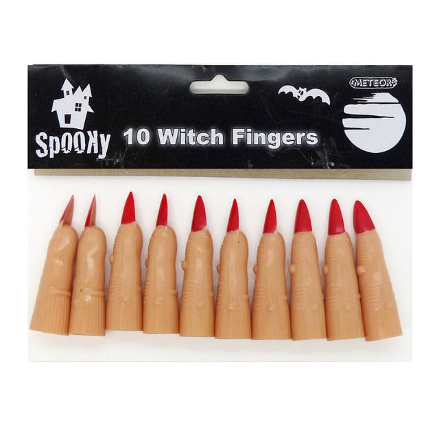I'll get you, my pretty! Set of 10 wicked witch fingers with long blood-red fingernails and bumpy warts.