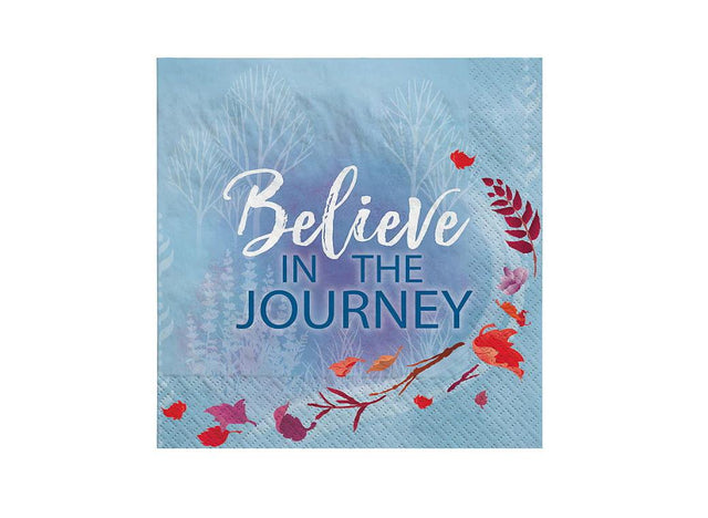 These smaller paper napkins feature the headline "Believe In The Journey" on a blue, forest background. They're the perfect size for accompanying cake and drinks at your Frozen celebration.