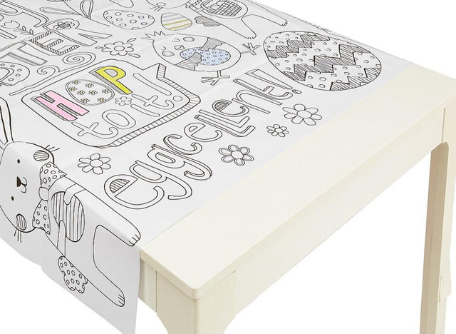 The paper table cover is white and features various Easter designs to colour in, including bunnies, chicks, Easter eggs, and more.