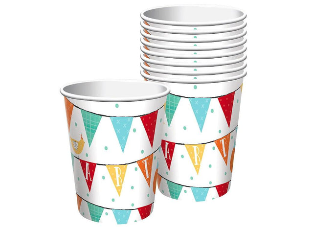 Serve your lil' farmers refreshments in these fun party cups illustrated with colourful party bunting.