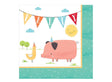 These cute lunch napkins feature friendly farm animals wearing party hats under a "PARTY" banner and smiling sun.