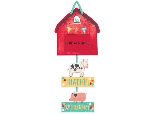The sign features a photo frame designed to look like a red barn, with cute cutouts of a cow and a pig hanging below.