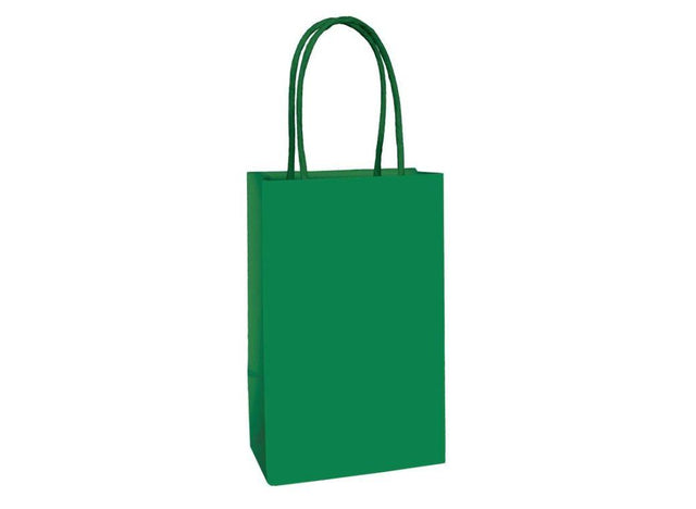 Pack of 8 festive green paper treat bags with coloured rope twist handles.