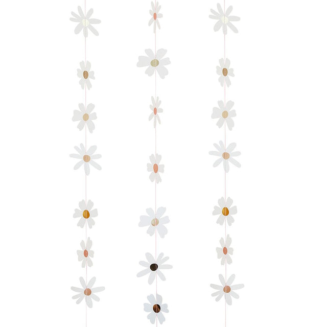 The garland features a 5m string of paper daisies with shiny gold foil centres. Use in one length or cut to multiple shorter lengths as required.
