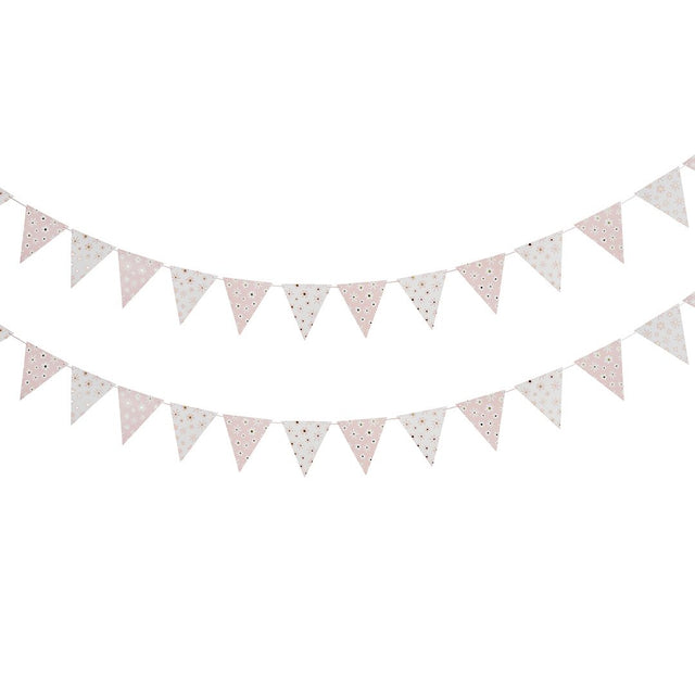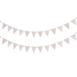 The flags measure 15cm high and are strung onto pink satin cord measuring 5m long.