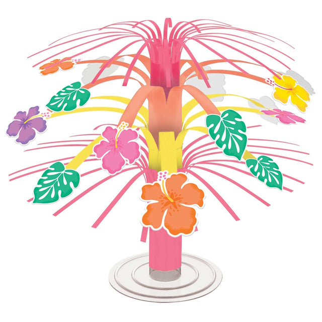 This colourful centerpiece features four tiers of cascading foil strips with hibiscus and monstera leaf cutouts at their ends, and a clear plastic stand for the base.