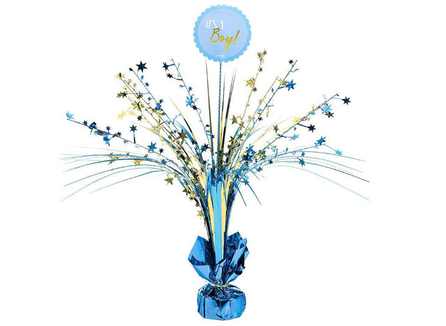 The centrepiece features a card cutout with "It's A Boy!" at the top, and wires with blue and gold foil star cutouts that can be fanned out.