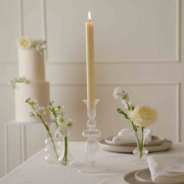 Dress your table with this stylish clear ribbed-glass dinner candle holder.