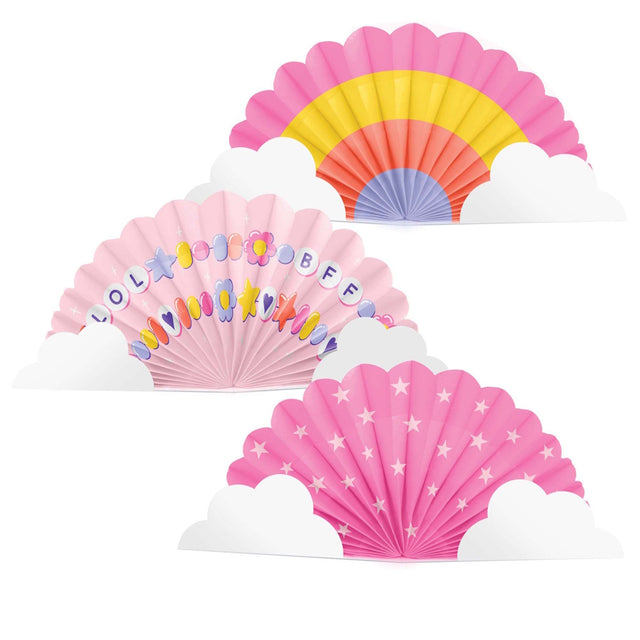 This set includes 3 half-circle paper fans in cheerful designs—rainbow, starry sky, and charm bracelet motifs—each resting in soft white clouds. Perfect for decorating your sleepover snack table or party zone!