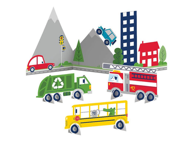 Featuring four freestanding cutoutsâa vibrant city backdrop, a recycling truck, a fire engine, and a busâthis set creates a fun and dynamic display for any vehicle-themed celebration.