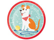 Serve your little ones yummy party food on these larger party plates featuring a cute orange and white pup and red border.