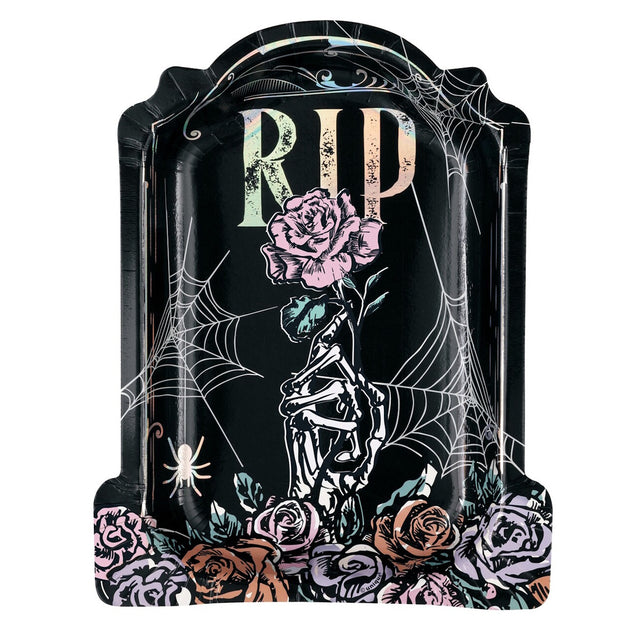 Add a touch of gothic elegance to your Halloween table with these Floral Skulls Tombstone Plates. Shaped like a tombstone and accented with shimmering iridescent details, the design features roses, spiderwebs, and a skeletal hand holding a bloom under the bold “RIP.”