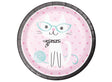 Serve paw-sh party food on these pink polka dot plates featuring a cute white cat with funky glasses.