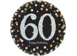 Stylish 60th birthday party plates in gold, silver and black with sparkling prismatic finish. Plates feature a dazzling "60" in the centre.