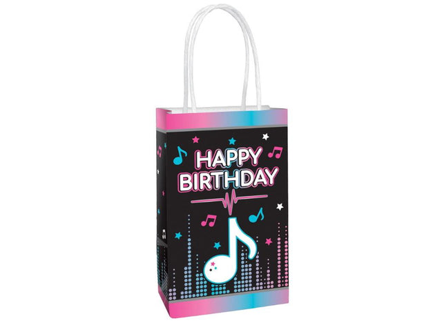 Send guests home with goodies in these TikTok inspired paper treat bags. The black, blue and pink bags feature music symbols and a "Happy Birthday" headline.