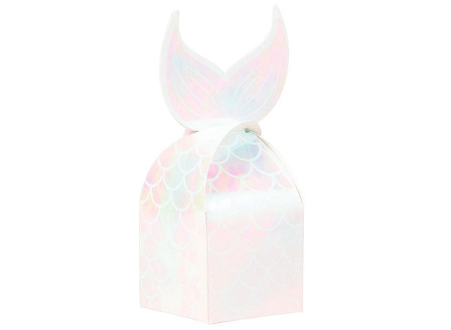 Covered in a shimming iridescent scale pattern, these gorgeous favour boxes have a mermaid tail at the top.