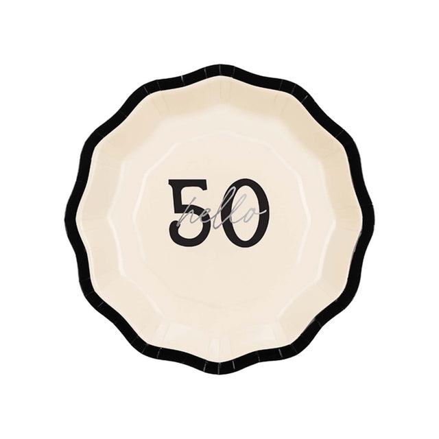 Featuring a soft cream base, bold black detailing, and a shiny silver “Hello” script layered over the statement “50”, these plates bring modern sophistication to any 50th birthday celebration.
