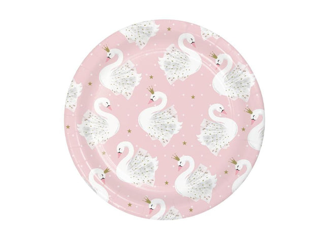 Adorned with graceful swans gliding on a sea of soft pink, these stylish lunch plates are perfect for serving cake and sweet treats at your Swan Party.
