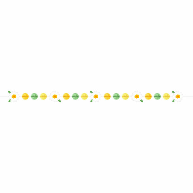 Garland has 5 daisies and 12 honeycomb balls strung onto white ribbon measuring 2.4m long. Cutouts measure approx 12cm diameter.