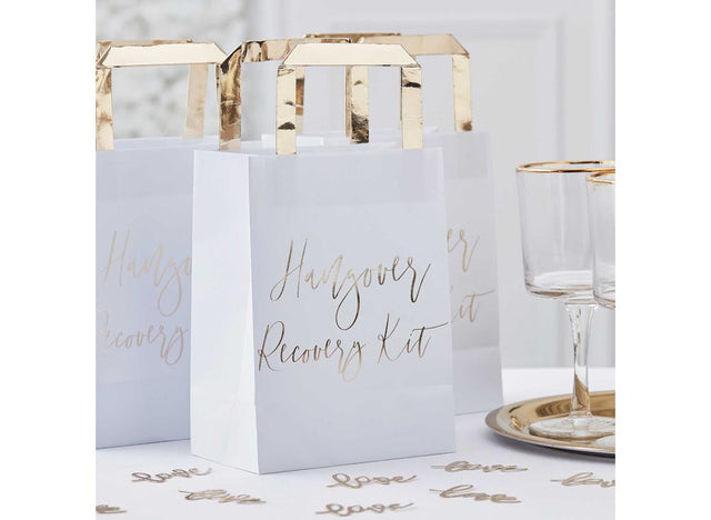 Make sure your guests are prepared for having all the fun at your hen do or wedding with these white and gold hangover receovery kit bags - they'll be thanking you the next day!
