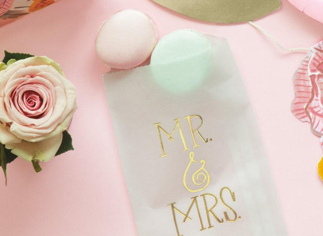 These pretty glassine treat bags have Mr & Mrs embossed in gold foil on the front. The semi-transparent greaseproof paper is great for holding sweets, cookies and other treats.